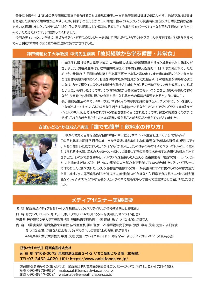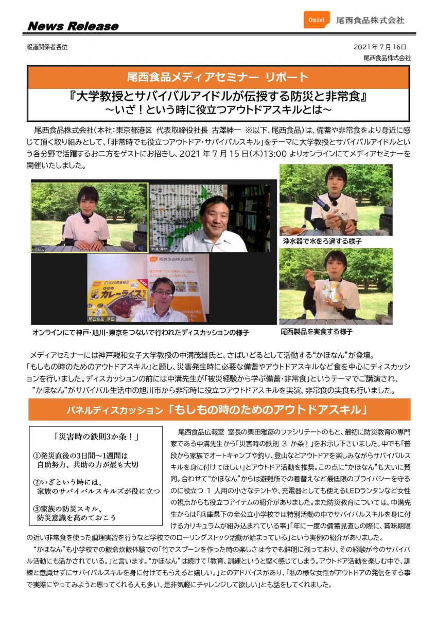尾西食品メディアセミナーリポート『大学教授とサバイバルアイドルが伝授する防災と非常食』 ~いざ!という時に役立つアウトドアスキルとは~