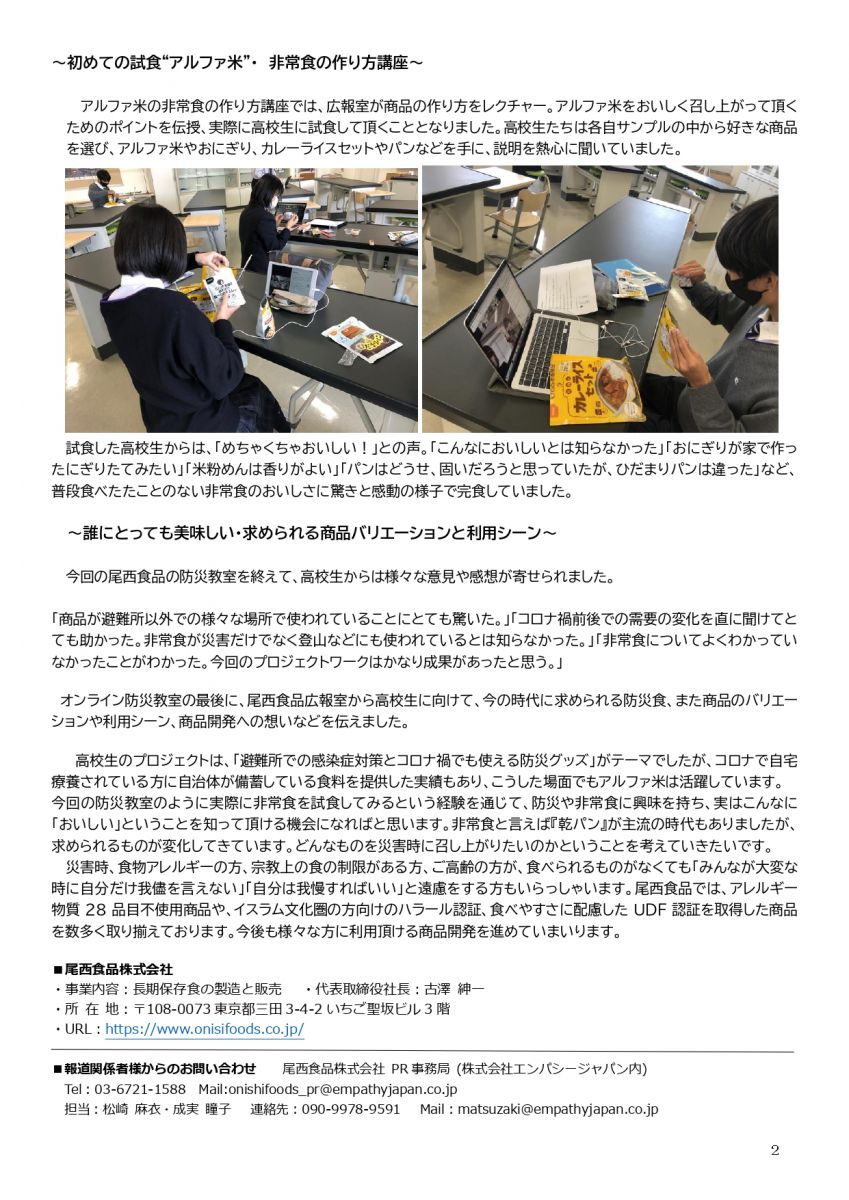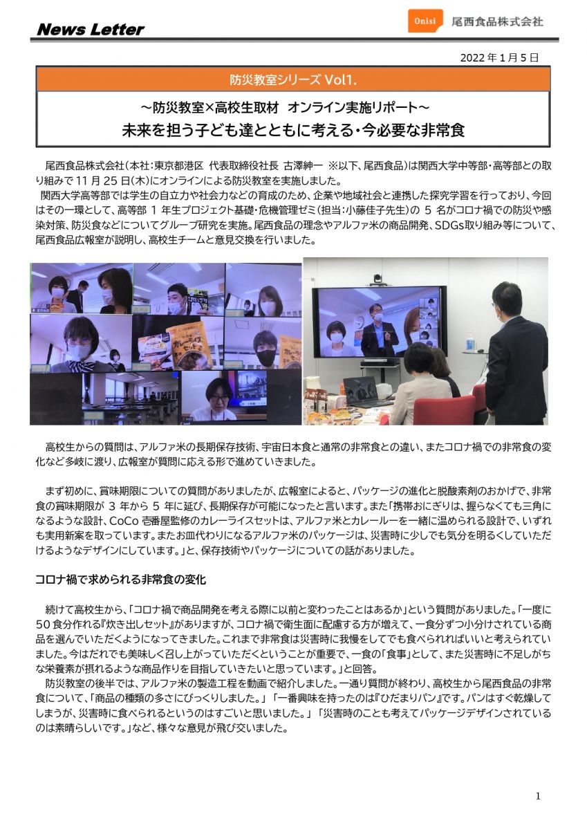 防災教室シリーズVol.1関西大学中等部・高等部オンライン防災講座実施リポートを公開『未来を担う子ども達とともに考える・今必要な非常食』