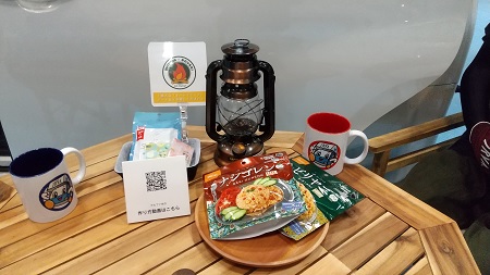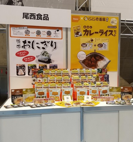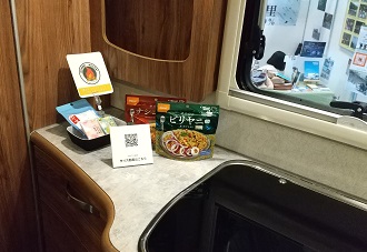 キャンピングカーでのご利用シーンを展示。軽くて持ち運びに便利なアルファ米は、キャンプやアウトドアでのご利用はもちろんのこと、常温での長期保存が可能なため、災害時などいざという時にも、ご活用いただけることを紹介させていただきました。