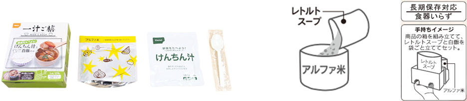 また、レトルトスープをアルファ米に注ぎ、炊き込みご飯風にすることで、お湯や水がない時でも食べることができます。お膳として利用できる箱に、スプーンが入っており、外箱を組み立ててセットすれば、片手で持つことができお膳の代わりになります。