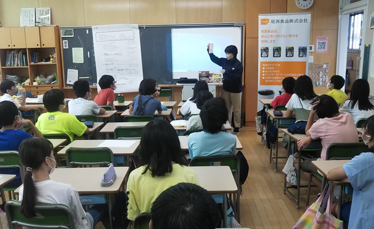 防災にまつわる様々な内容について、高輪台小学校教職員の方をはじめ、高輪地区防災ネットワークや消防署、PTAボランティアの方による授業が行われました。尾西食品では、なぜ非常食が必要なのか、種類や活用法、製造工程、災害の備えについて説明するとともに、児童からの非常食に関する様々な質問に答えました。