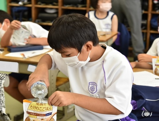 今回、児童達には実際に「水」でアルファ米「尾西のたけのこごはん」を作る体験をしてもらいました。商品が一人ひとりに配布されると、「どうやって作るのかな」「賞味期限が長いね」と興味津々な様子でした。