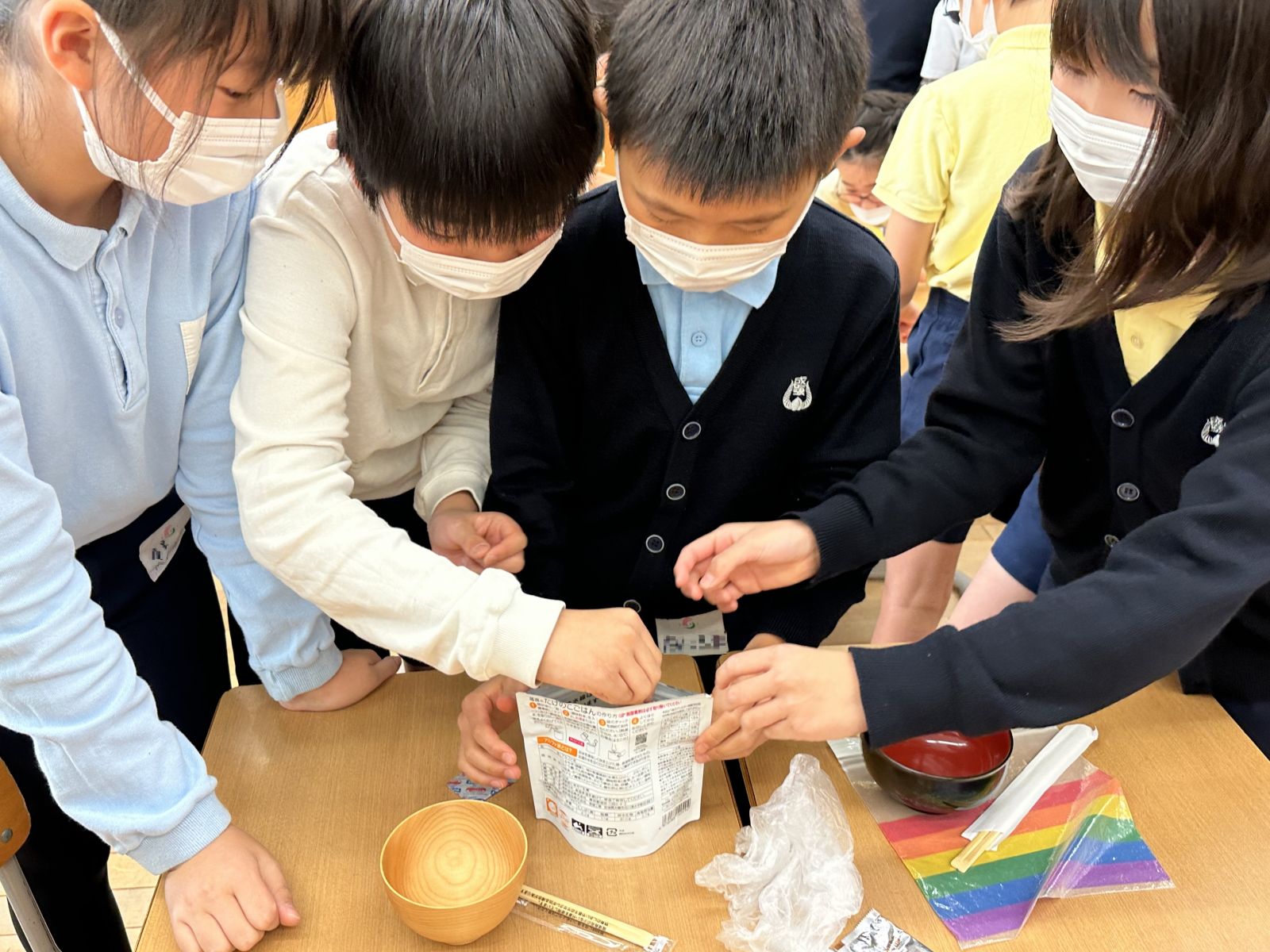 事前の質問も踏まえながら、授業の中で、非常食の重要性や種類を伝え、アルファ米の製造工程を見てもらった上で、実際に「水」でアルファ米「尾西のたけのこごはん」を作る体験をしてもらいました。児童同士で意見を交わしながら、途中質問の声も多く挙がり、高い関心を持って楽しく学んでもらえた様子が伝わりました。