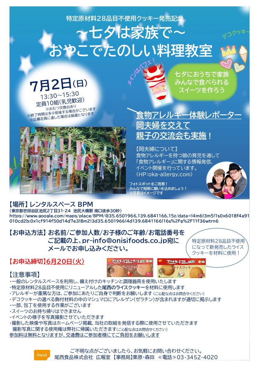 尾西のライスクッキーリニューアル発売記念イベント~七夕は家族で~おやこでたのしい料理教室~募集開始!