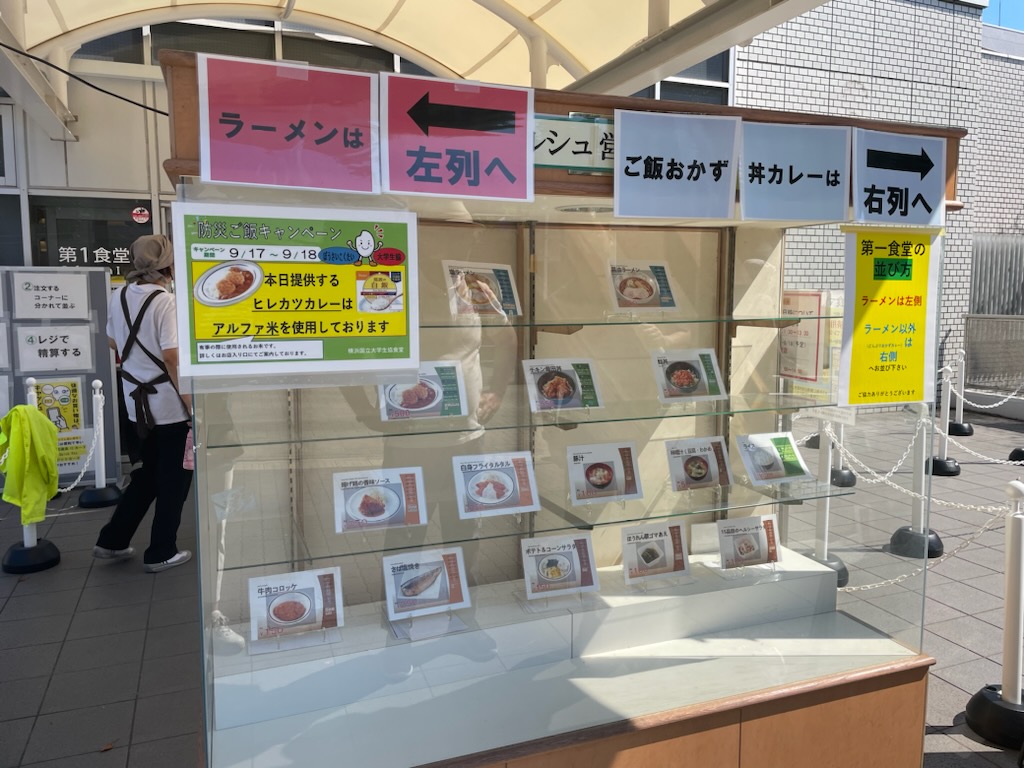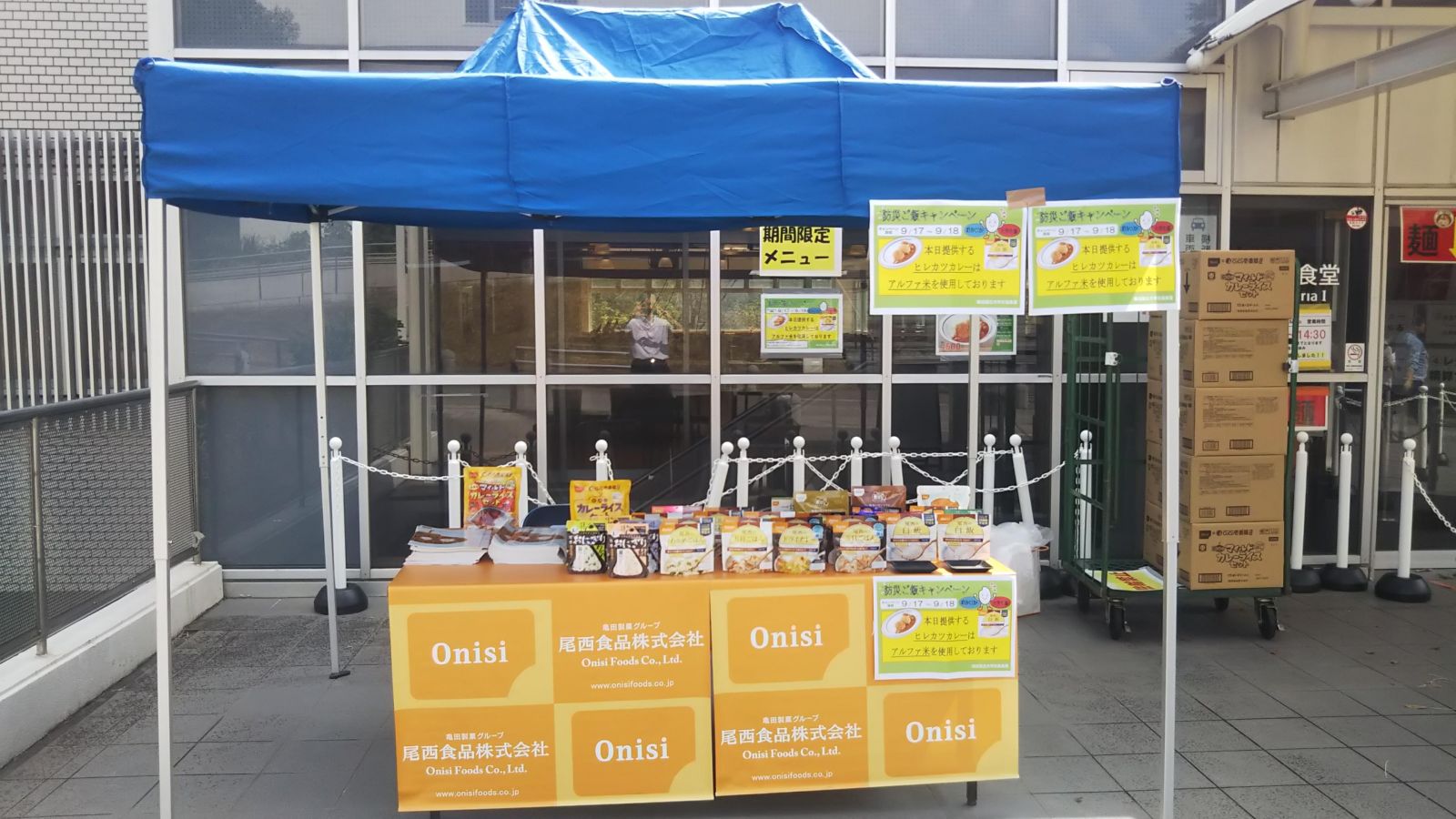 学食前では尾西食品の商品を展示させてもらい、アルファ米のご案内を致しました