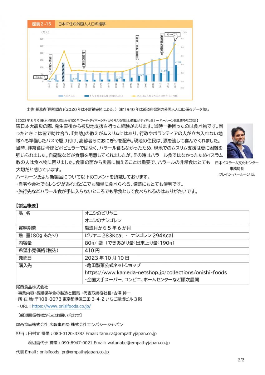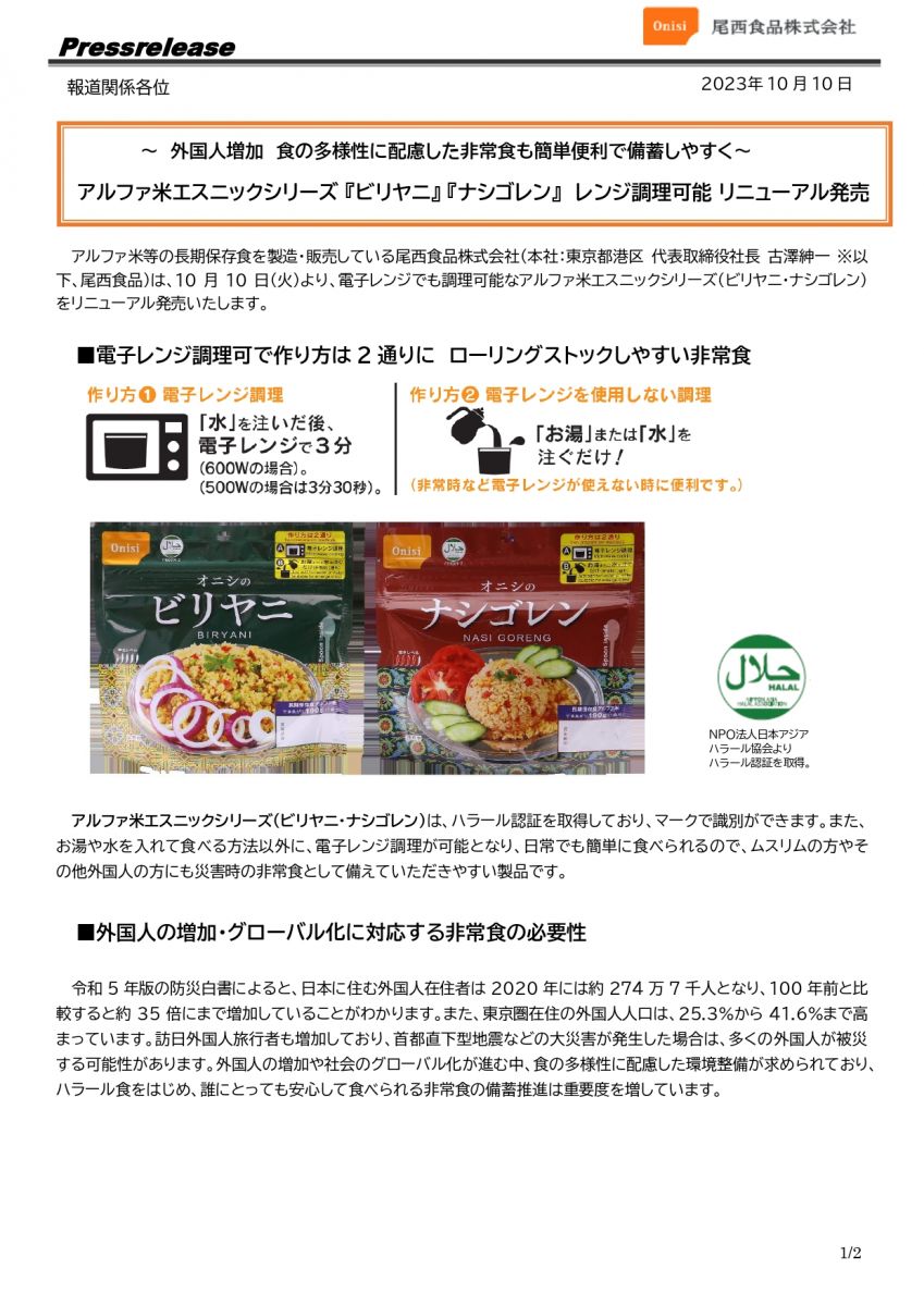 アルファ米エスニックシリーズ 『ビリヤニ』 『ナシゴレン』 レンジ調理可能 リニューアル発売 ~外国人増加 食の多様性に配慮した非常食も簡単便利で備蓄しやすく~