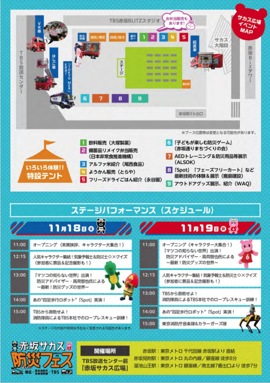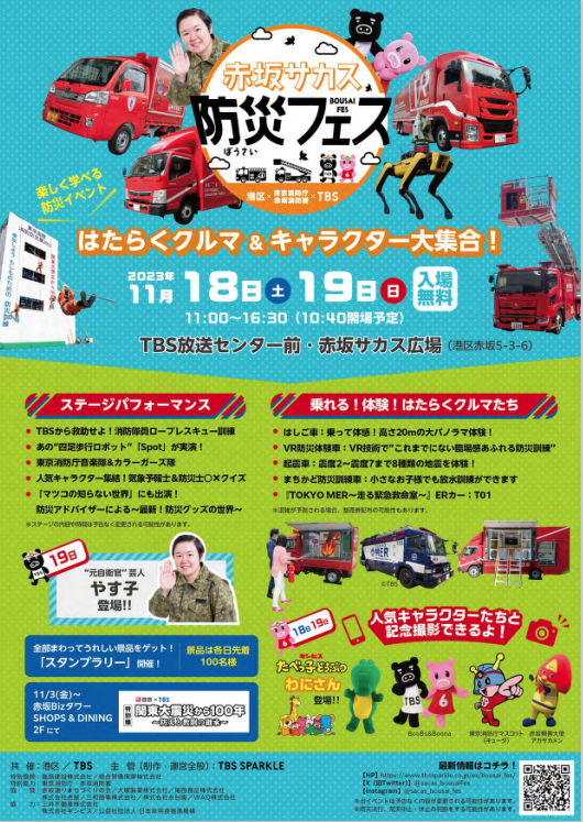 11月18日(土)~11月19日(日)にTBS放送センター前 赤坂サカスで開催される赤坂サカス防災フェスに参加します。