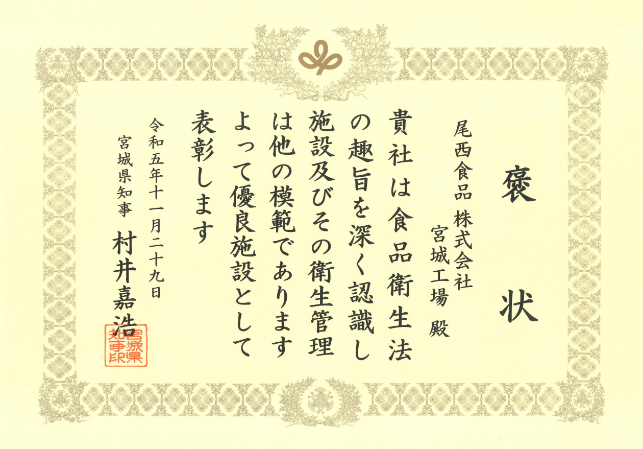 この度、当社宮城工場が「令和5年度 食品衛生優良施設 宮城県知事表彰」を受賞しました。