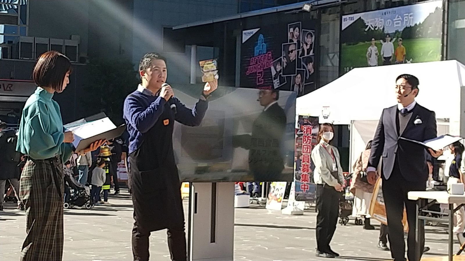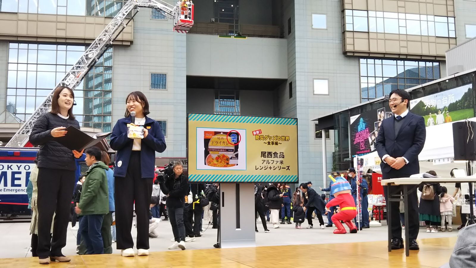 ステージでは、防災グッズアドバイザーの高荷智也さんが、最新非常食として尾西のアルファ米レンジ+(プラス)シリーズを紹介してくださいました。