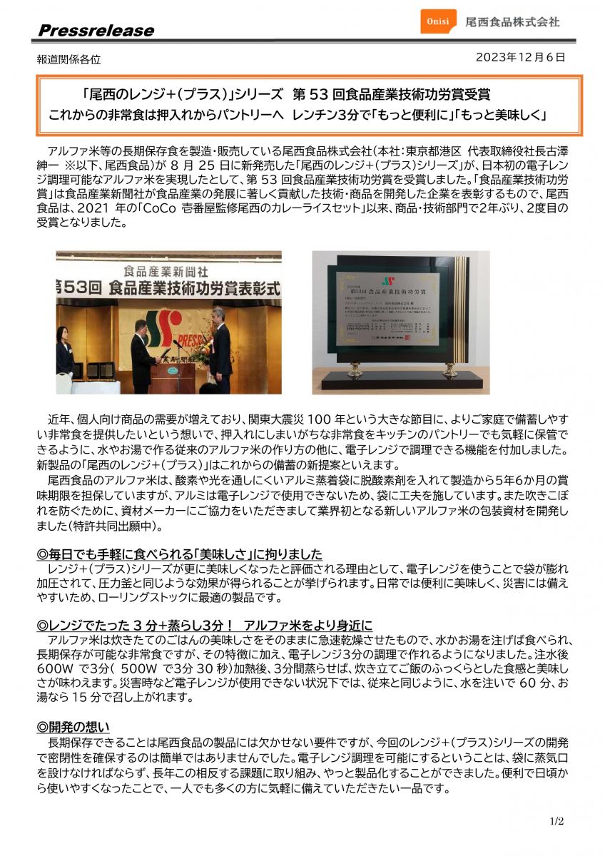 「尾西のレンジ+(プラス)」シリーズ 第53回食品産業技術功労賞受賞 これからの非常食は押入れからパントリーへ レンチン3分で「もっと便利に」「もっと美味しく」