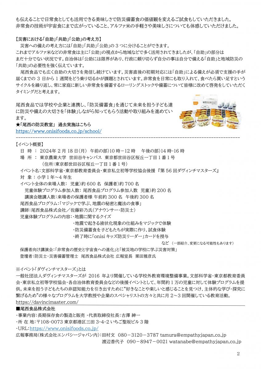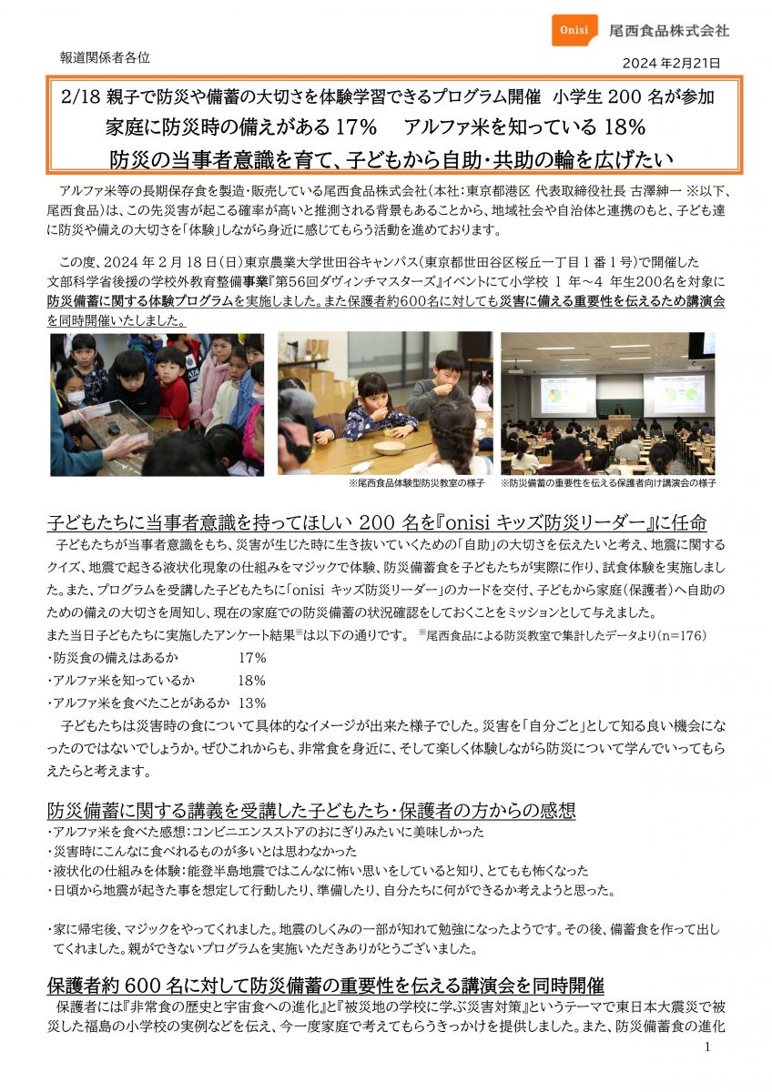 2/18 親子で防災や備蓄の大切さを体験学習できるプログラム開催 小学生200 名が参加