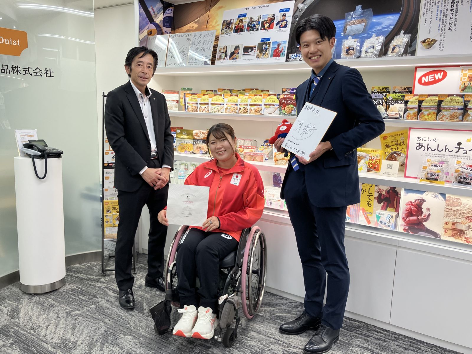 東京パラリンピックに続き、パリパラリンピック女子車いすテニスに出場した高室冴綺選手(㈱スタートライン所属)がパリパラリンピックのウエアを着て本社にお越しくださいました。