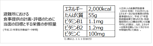 ・避難所における栄養の参照量(詳細下表)として示されているビタミンB1,B2,Cが1日の1/3以上含まれている