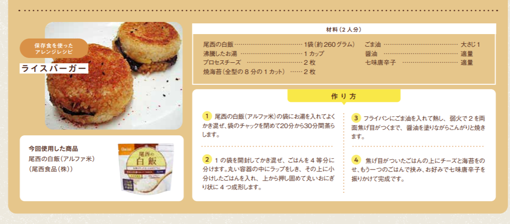 アルファ米白飯を使用したアレンジレシピ「ライスバーガー」が紹介されました。