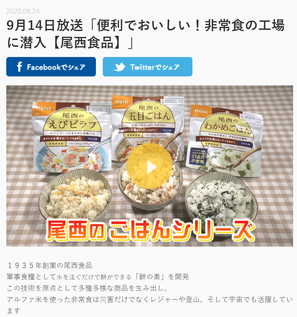 KHBオンデマンド9月14日放送「便利でおいしい!非常食の工場に潜入【尾西食品】」
