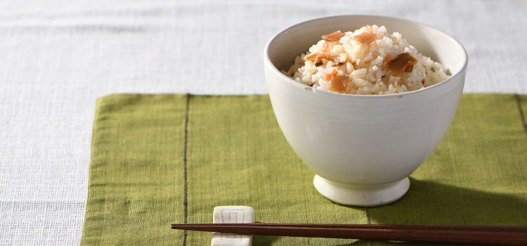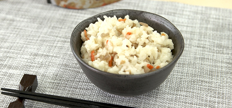 かき混ぜる具材の味がごはんになじむようによくかき混ぜてください。※調味粉末使用製品は、調味粉末を溶かすようによくかき混ぜてください。