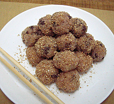 3のビニール袋の中に2の団子を入れて袋の上部を閉め、袋を振ることですりごまをまぶします。