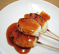 潰したごはんを小判型に成型し、割り箸等に通しくっつけます。