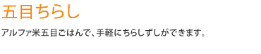 1のアルファ米(五目ごはん)を平らな容器に開けて手早くほぐし、すし酢をふりかけながら混ぜ、すし飯を冷ましておきます。