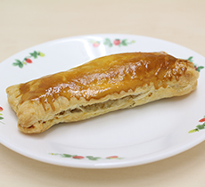 1で作ったフィリング(具材)をパイシートにはさみ、縁をフォークで閉じ、上に卵黄を塗る。