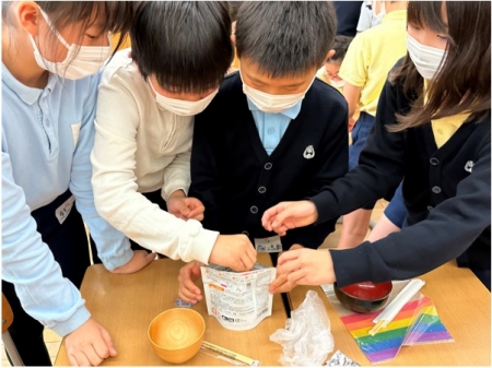 成蹊小学校では以前より防災の取り組みを進めており、東北被災地と連携した授業なども行われています。そして今回、4年生約 120 名を対象にアルファ米の防災教室を実施しました。