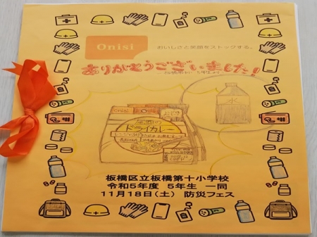 板橋第十小学校の5年生を対象とした非常食や備えの大切さについて学ぶ防災教室を実施しました。 実施日:令和5年11月10日(金) 学年:5年生 人数:94名 科目:総合的な学習の時間 ※板橋第十小学校の防災フェス(探求発表会)の事前学習 形式:オンライン 防災フェス終了後に尾西食品に素敵なお手紙をいただきました。