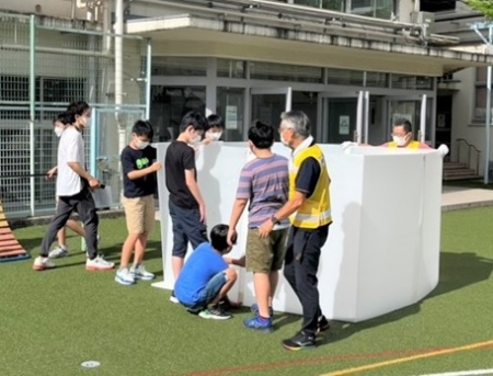 御田小学校では、毎月避難訓練を実施。災害時を想定して児童の発達段階に応じた防災教育・体験活動を行っています。今回は「学校が地域の避難所であることを知り、防災意識を高める」「防災について出来ることを地域の人と連携し学習する」ことを目的とし、学校・地域の防災協議会・消防署・PTAボランティアが連携して5・6年生の児童を対象とした避難所運営・非常食についての学習・消火器体験を実施しました。