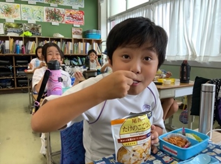 今回、児童達には実際に「水」でアルファ米「尾西のたけのこごはん」を作る体験をしてもらいました。商品が一人ひとりに配布されると、「どうやって作るのかな」「賞味期限が長いね」と興味津々な様子でした。